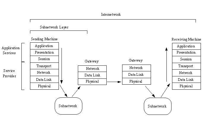 On top of the subnetwork layer is the internetwork layer, which provides the functionality for communications between networks through gateways. Each subnetwork uses gateways to connect to the other subnetworks in the internetwork. The internetwork layer is where data gets transferred from gateway to gateway until it reaches its destination and then passes into the subnetwork layer. The internetwork layer runs the Internet Protocol (IP).