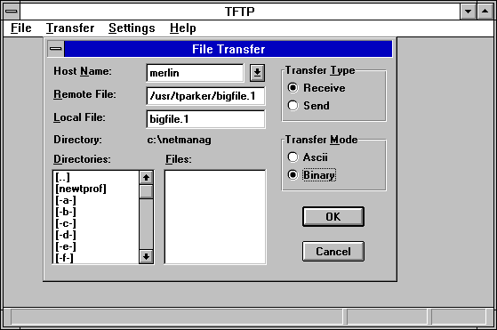 TFTP is available on all UNIX systems as well as in TCP/IP suites for other operating systems. Figure 6.13 shows the TFTP utility from ChameleonNFS, which lets you enter the remote host name, the remote and local filenames, and the type of transfer you want. The file transfer is then performed in the background using UDP.